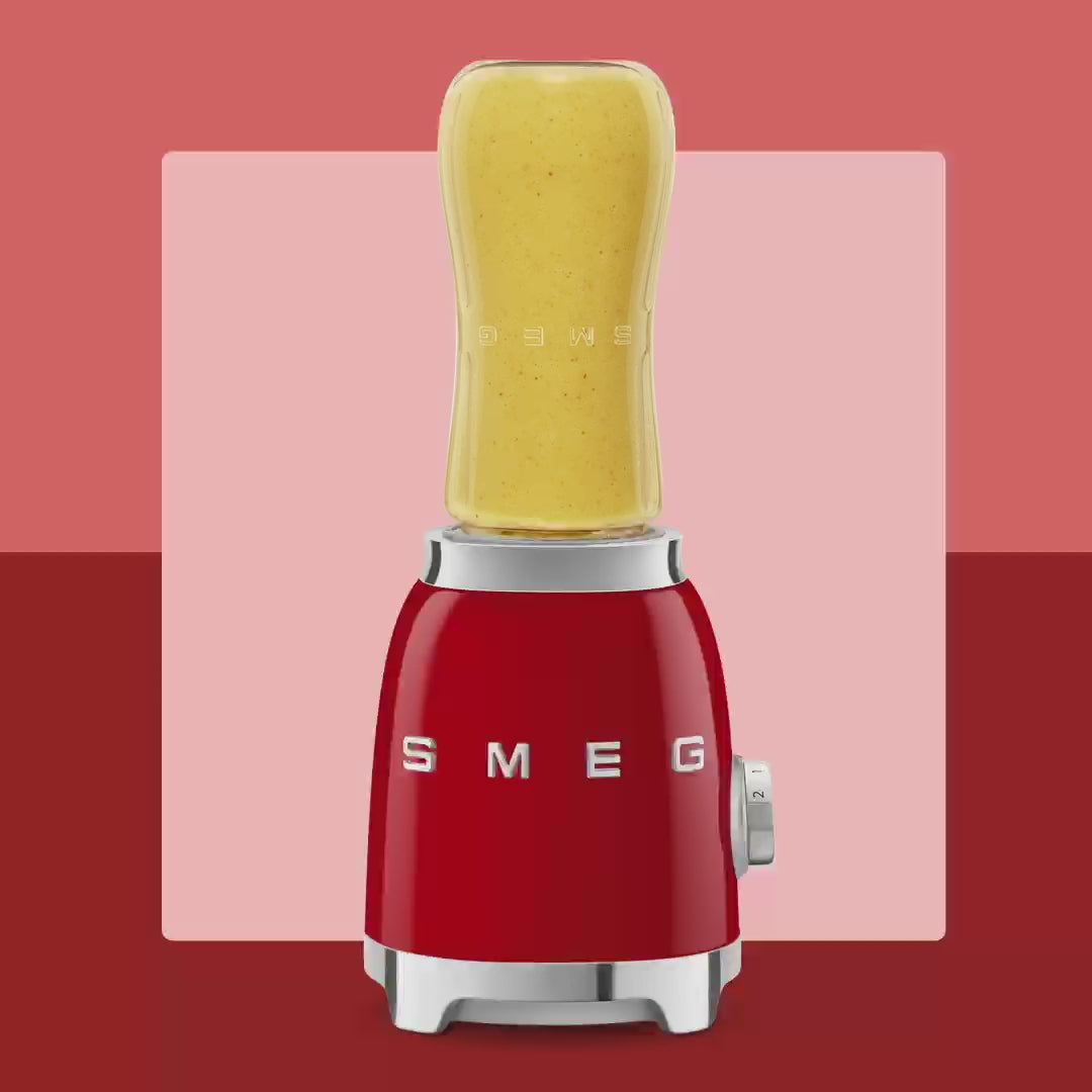 Introducing the SMEG Personal Blender, where vintage aesthetics meet blending power. With 250W of motor power, this glossy beauty is perfect for your food preparation needs. It offers two speed levels controlled by a knob for customized blending. The Tritan™Renew jug with a lid and measuring cap is not only durable but also dishwasher-safe for easy cleaning. Safety features like overload motor protection and a safety engine block ensure worry-free blending. With a compact design, anti-slip base, and integrated cord wrap, it's both stylish and user-friendly. Elevate your blending experience with SMEG's retro charm.